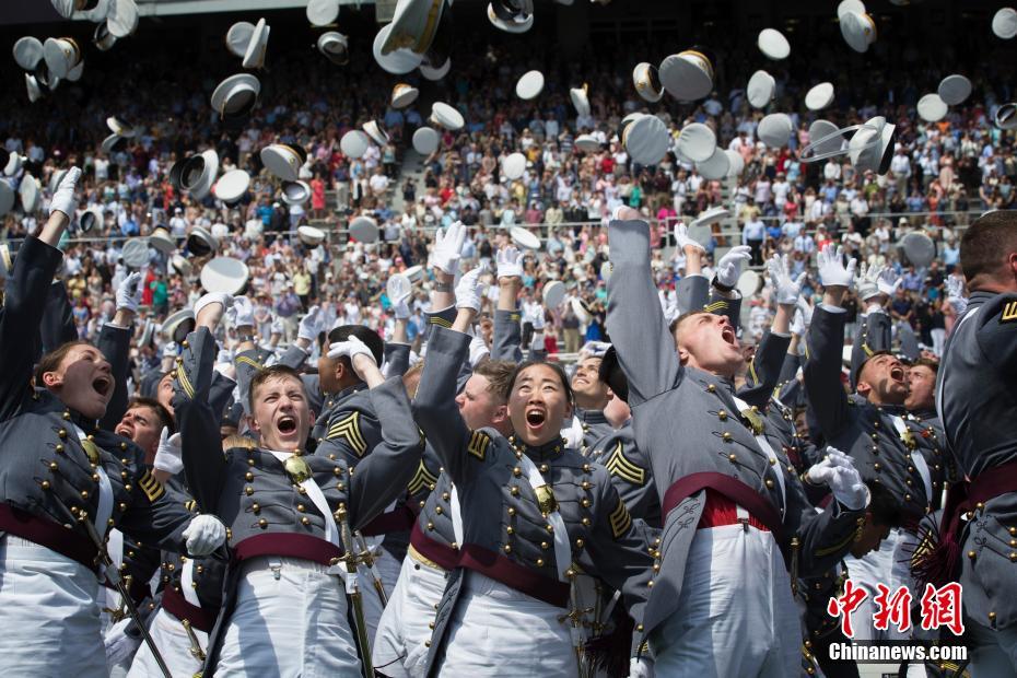 当地时间5月26日,美国著名军事院校西点军校在位于纽约州西点镇的校园体育场举行2018届毕业生的毕业典礼,972名军校学员经过四年学习后毕业,学员们入场参加毕业典礼。西点军校创办于1802年,是美国第一所军事学校。图为华人毕业生王谦爱(前排中)在毕业典礼上扔起军帽。 中新社记者 廖攀 摄