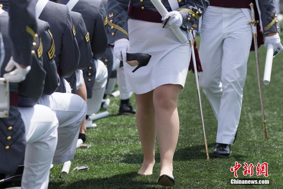 当地时间5月26日,美国著名军事院校西点军校在位于纽约州西点镇的校园体育场举行2018届毕业生的毕业典礼,972名军校学员经过四年学习后毕业,学员们入场参加毕业典礼。西点军校创办于1802年,是美国第一所军事学校。图为一名崴脚的女生提鞋行进。 中新社记者 廖攀 摄