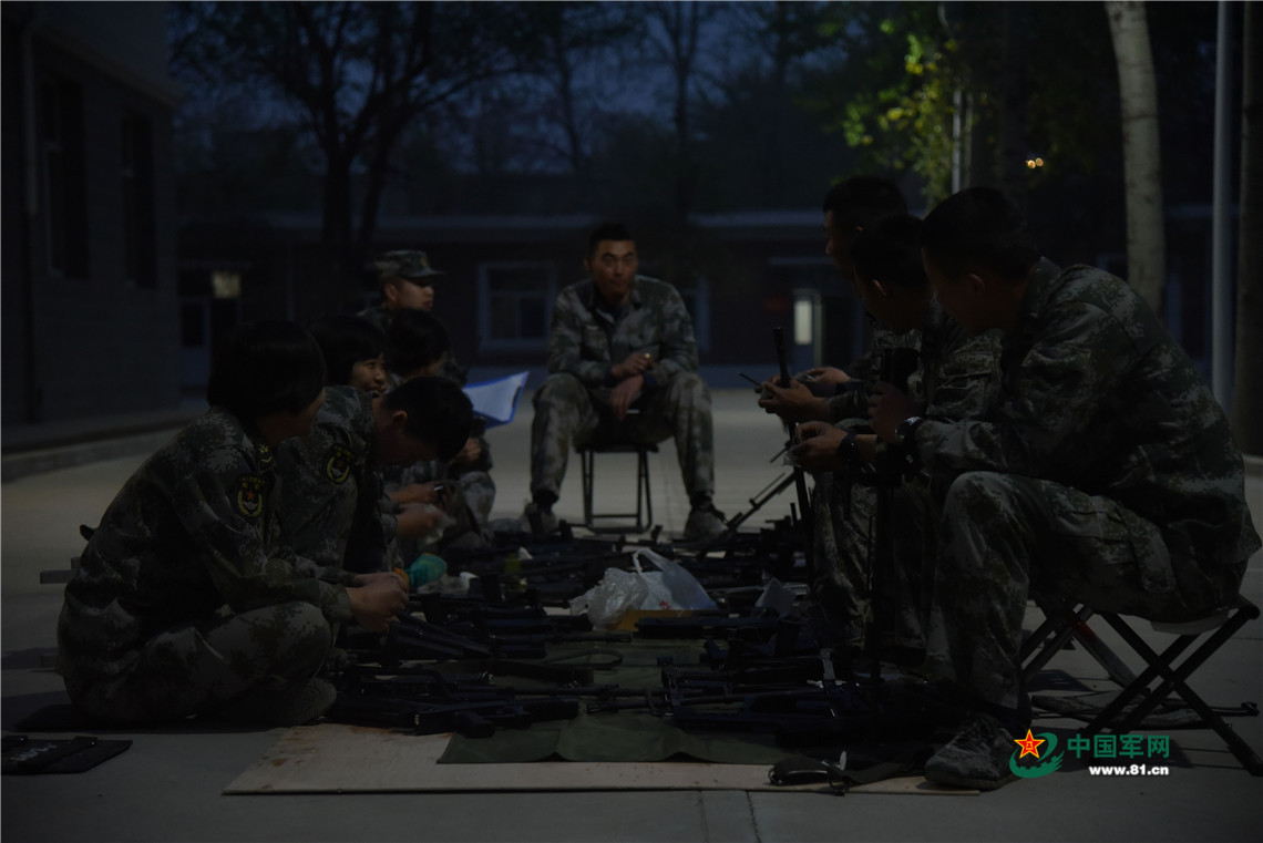 夜晚,教练员和队员一边擦拭枪支,一边总结当天的训练情况。(袁晓清摄)