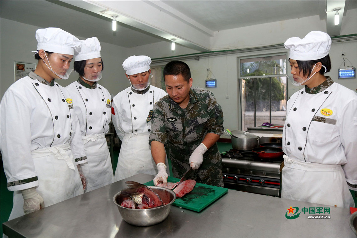 炊事教员孙华龙正在教授队员炊事技巧。孙华龙教练曾在俄罗斯“国际军事比赛-2016野战炊事”民族菜肴展示中获第一名。(刘健摄)