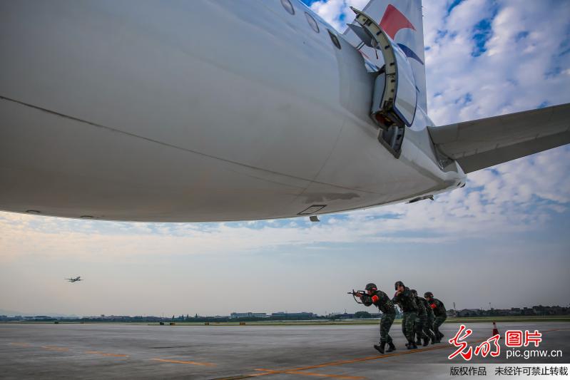 当日,武警浙江总队组织浙东片区特战分队在宁波栎社机场举行反恐处突演练。特战队员进行了"反劫机"战术研究、抵近侦查、快速突击等课目的训练,在近似实战环境中全面检验特战队员遂行多样化任务的能力,锤炼特战分队克敌制胜的本领。(殷福军摄/光明图片)