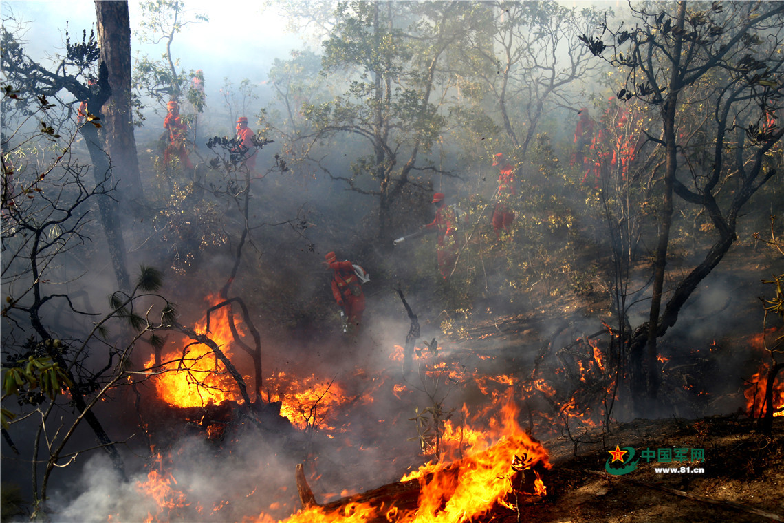 2017年4月,官兵扑救凉山州木里县俄亚乡森林大火。