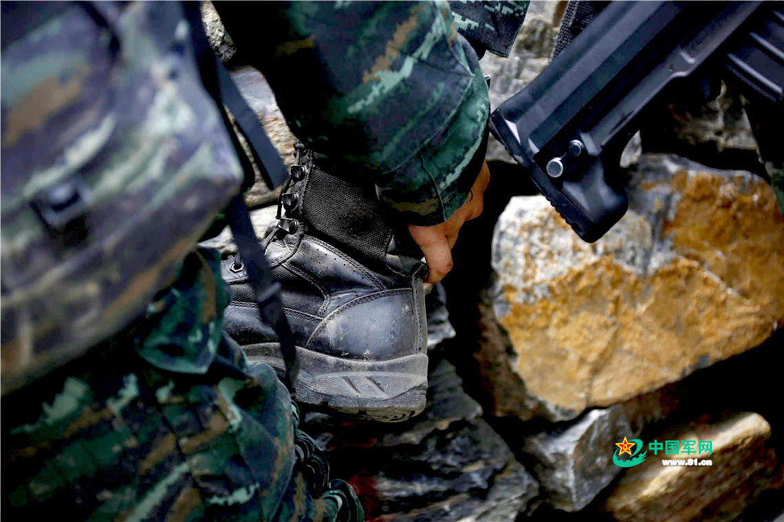 两名特战队员彼此协助通过碎石坡,她们以膝盖为踩踏点,以防踩上碎石跌落山谷。