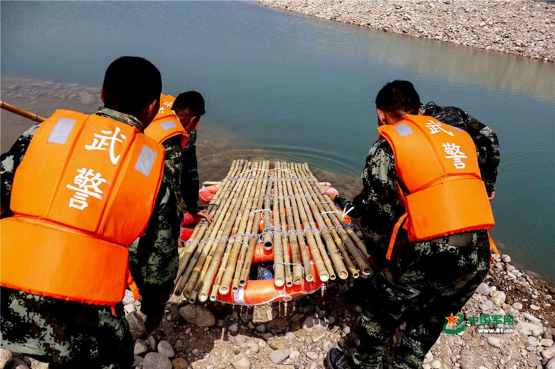 特战队员抬着制作好的“船”下水。冯开华 摄