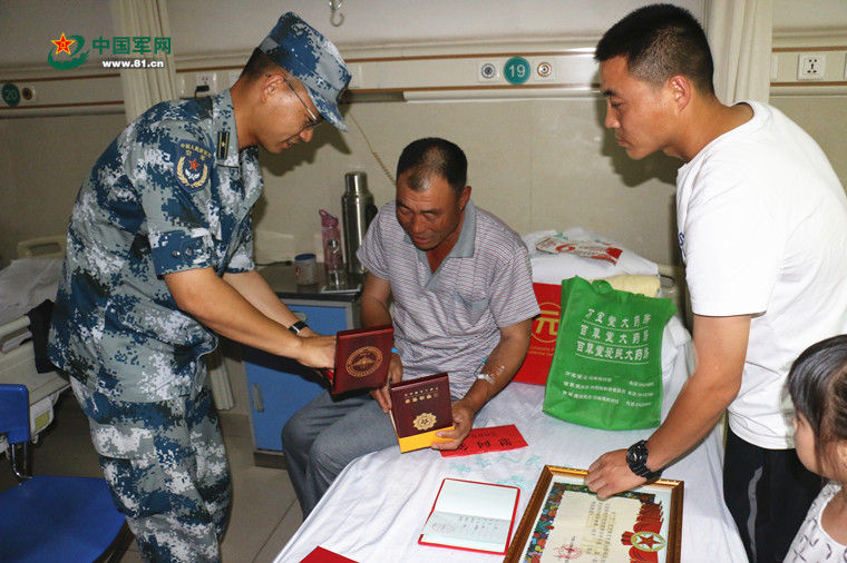 河北保定:慰问代表来到安宁父亲病床前,向安宁父亲介绍儿子立功始末。