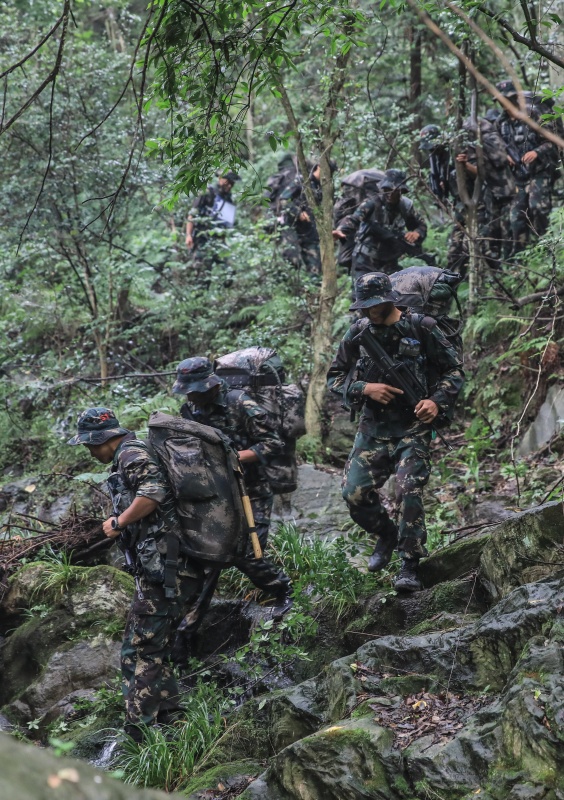 空军“猎人”集训队第十小组穿过鄂北某原始森林搜索目标点(资料照片)。