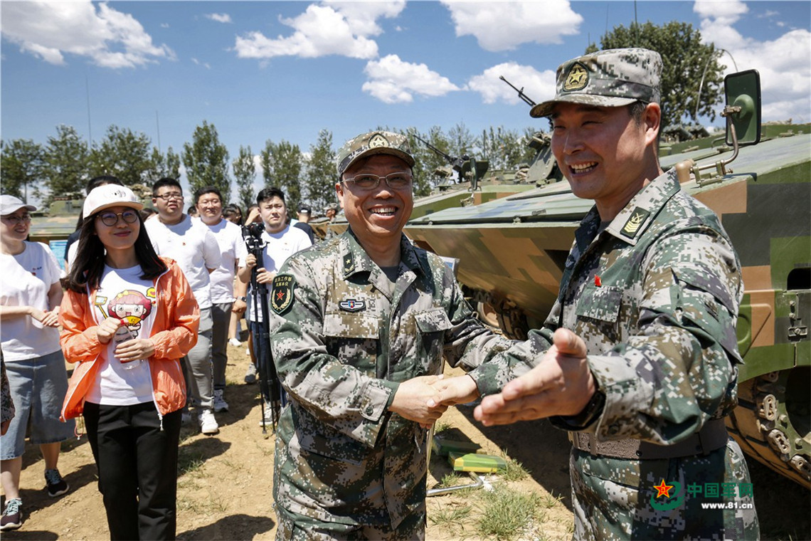 四次参加阅兵的丁辉(右)向大家介绍装备情况。
