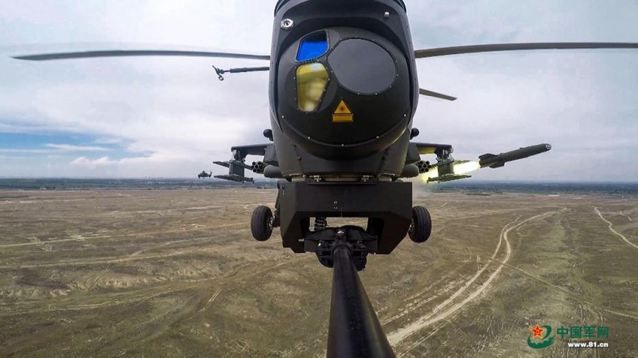 武装直升机群在连长王光泽空中实时指挥下,不断变化连战术队形,抵近攻击目标后,6架直升机一字排开模拟超低空火力突防,实施火力打击后,直升机两两组成双机编队从侧方退出,以不到20米的飞行高度大坡度快速前出进行迂回攻击。吴世科 于光彤 摄影报道 图片来源:中国军网