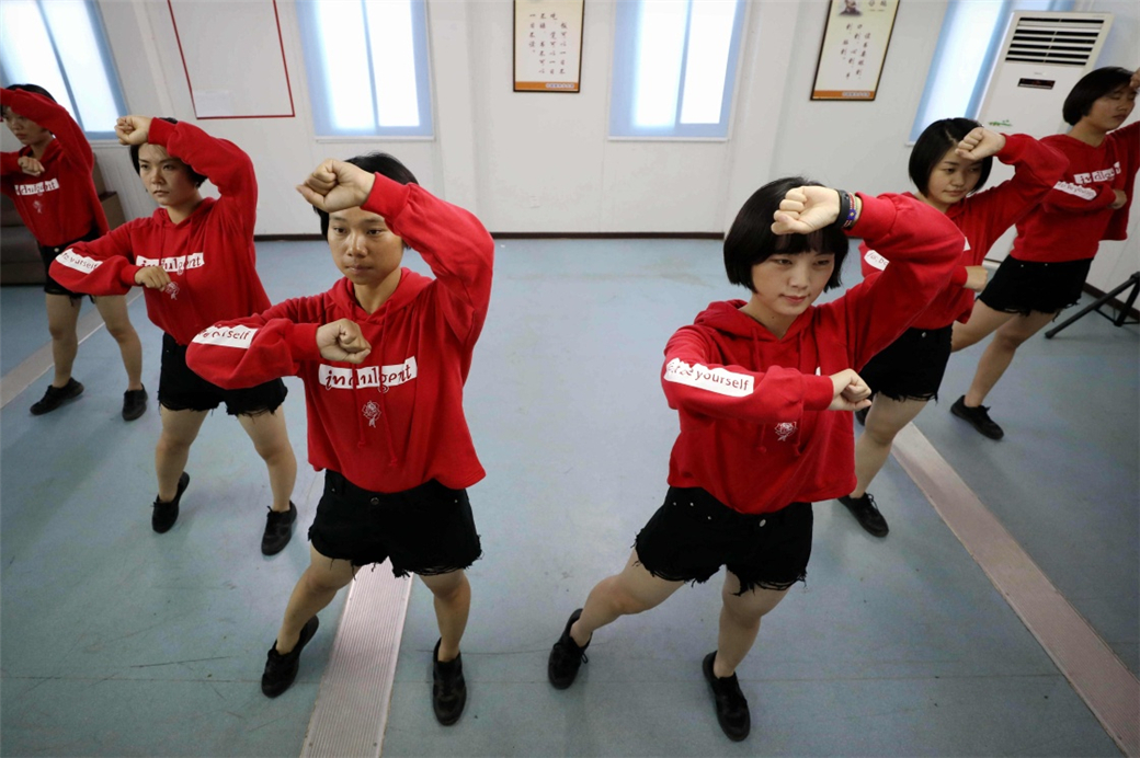 2018年4月30日,在南苏丹中国维和步兵营,于培杰(左三)与战友在健身房排练舞蹈。新华社记者 王腾 摄