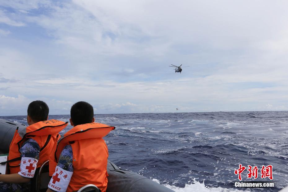 当地时间7月4日上午,赴大洋洲、中南美洲执行“和谐使命-2018”任务的中国海军和平方舟医院船,在太平洋某海域举行了一场复杂海况下的全员额、全要素、全流程海上医疗救护与后送演练。图为救护直升机通过索降救生员成功救起“落水人员”。中新社发 史奎吉 摄