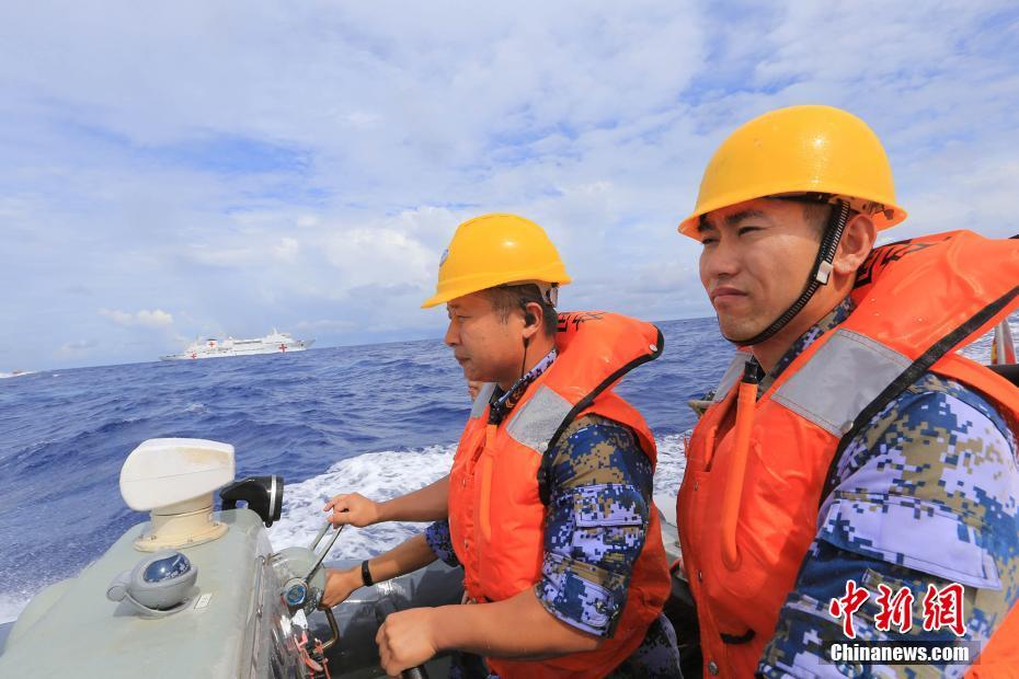 当地时间7月4日上午,赴大洋洲、中南美洲执行“和谐使命-2018”任务的中国海军和平方舟医院船,在太平洋某海域举行了一场复杂海况下的全员额、全要素、全流程海上医疗救护与后送演练。图为和平方舟医院船官兵驾驶高速小艇搜救“落水人员”。中新社发 史奎吉 摄