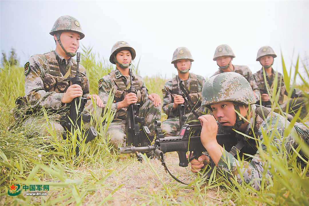 班长进行射击动作要领示范,张松(左一)和战友认真学习。