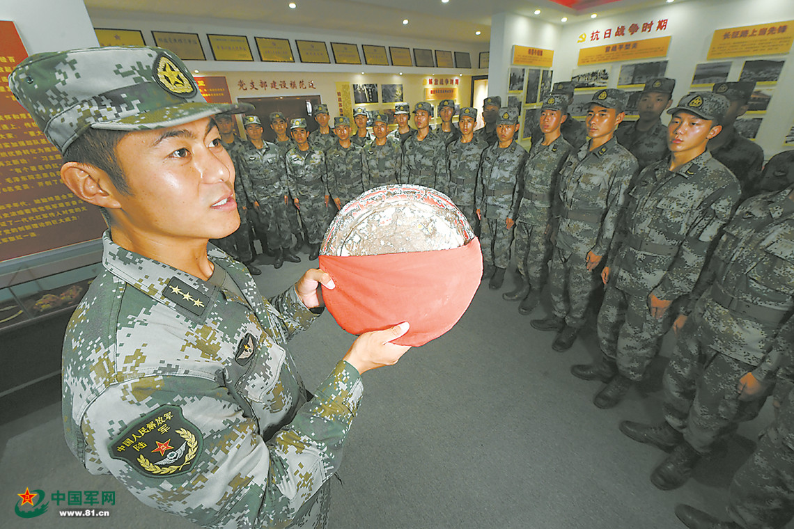 红一连指导员手拿连队传家宝——红菜盘给官兵讲传统。