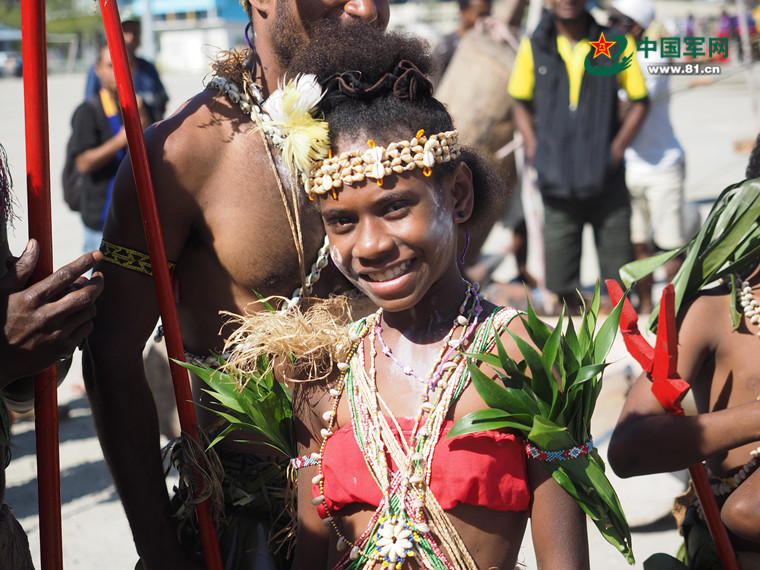 当地时间7月11日,在巴布亚新几内亚莫尔兹比港码头,当地民众跳起传统舞蹈热情欢迎中国海军和平方舟医院船。江山摄