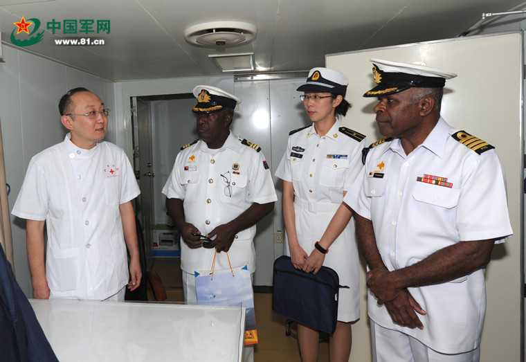 当地时间7月11日,在巴布亚新几内亚莫尔兹比港,巴布亚新几内亚军政官员参观中国海军和平方舟医院船。江山摄