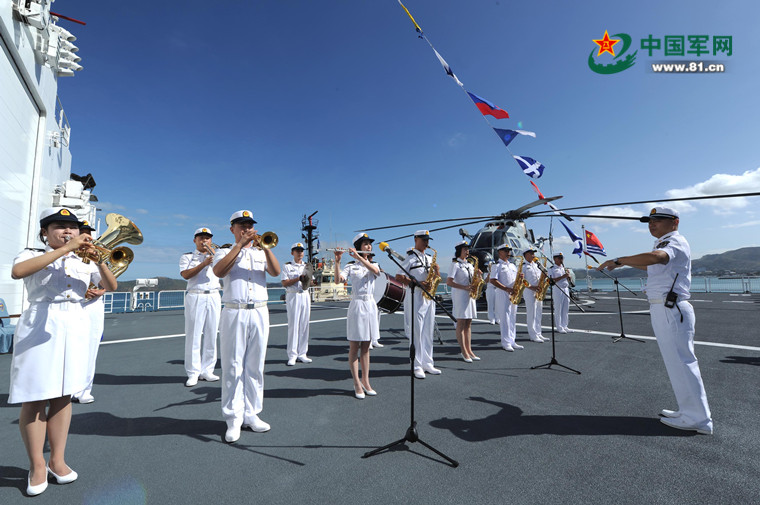 当地时间7月11日,中国海军和平方舟医院船缓缓驶进巴布亚新几内亚莫尔兹比港时,水兵军乐队在甲板列队站坡演奏。江山摄