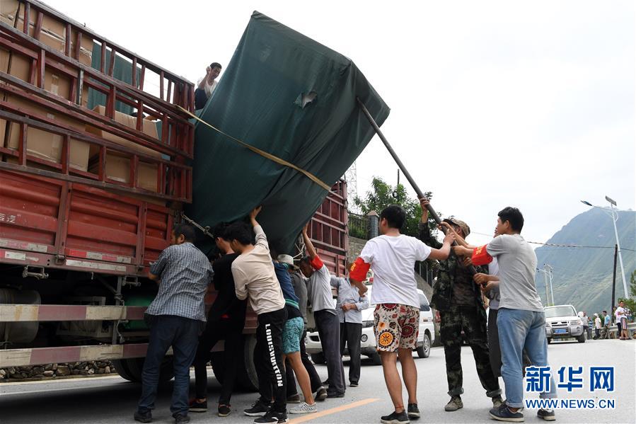 7月15日,在舟曲县南峪乡,志愿者及村民从车辆上搬运救灾物资。当日,按照甘肃省舟曲防汛抢险指挥部部署,舟曲县江顶崖山体滑坡崩塌险情处置有序进行。自然资源部、水利部派出的专家组已抵达舟曲,与甘肃省有关方面专家赴现场开展查勘工作,分析会商滑坡成因、发展趋势,研究应急处置方案。调拨的救灾物资已陆续抵达,防汛抢险各项具体工作统筹展开。新华社记者 范培珅 摄