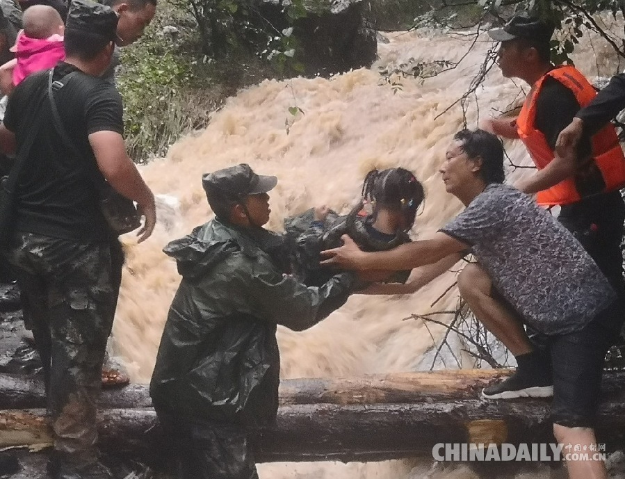 2018年7月15日,陕西汉中,救援人员现场架桥,将被困群众安全转移。