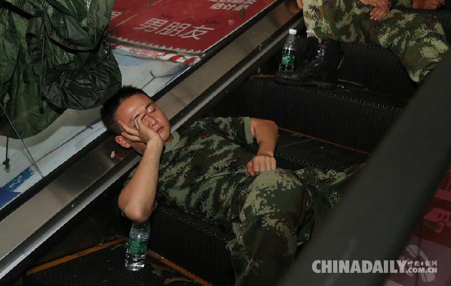 不分时间,不分地域,抢险救灾中,总能看到他们的身影。2017年8月24日,珠海,四天两历台风,高难度睡姿背后是常人难以理解的疲惫。