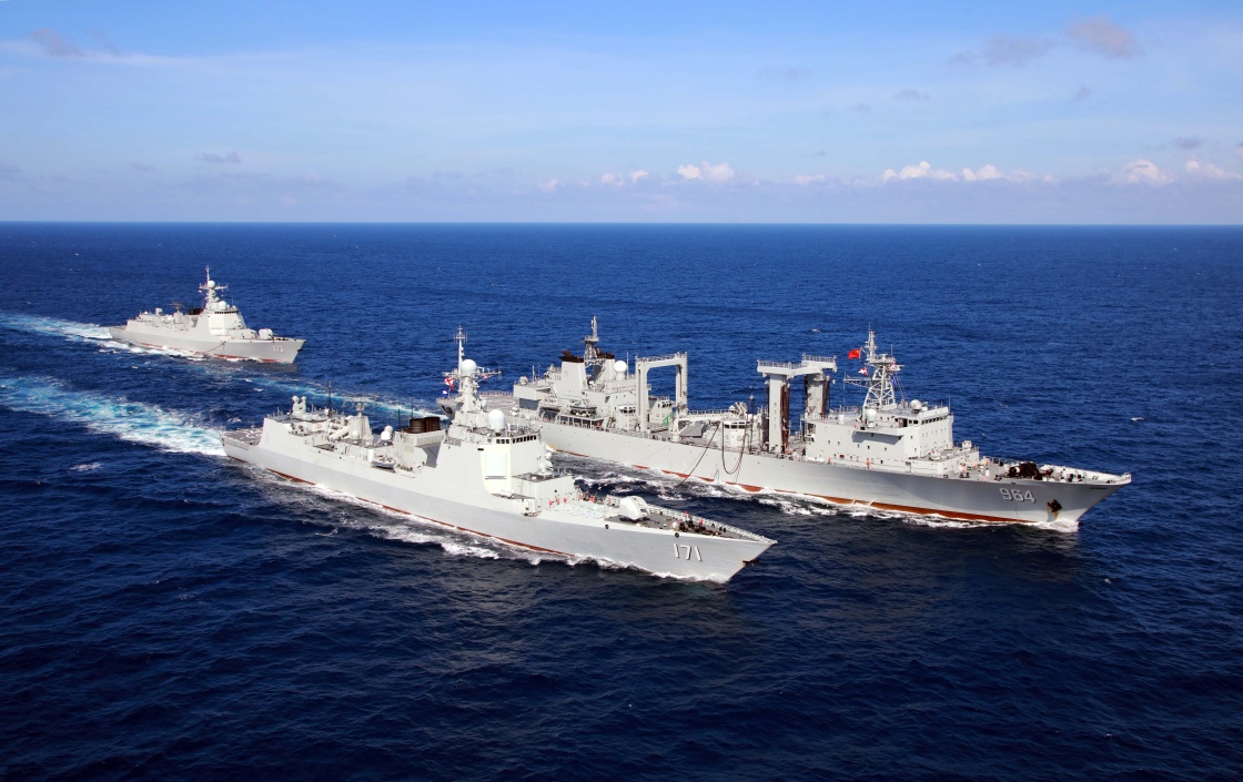 远海训练中,海口舰进行海上补给(2017年2月25日摄)。新华社发周启青摄