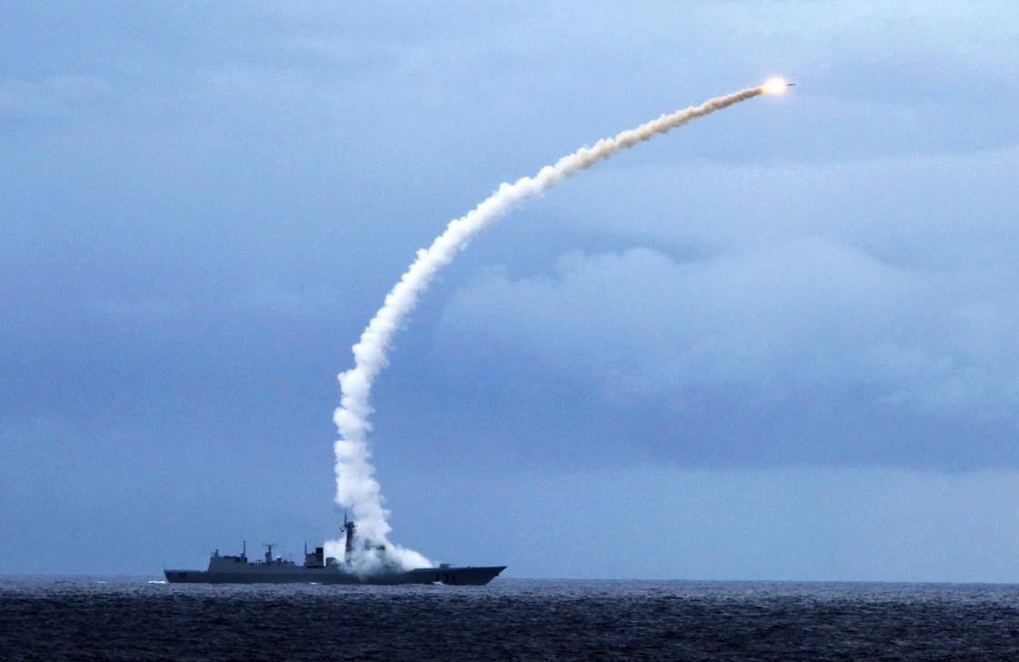 海口舰在实弹演习中发射舰空导弹拦截来袭目标(2010年7月26日摄)。新华社发