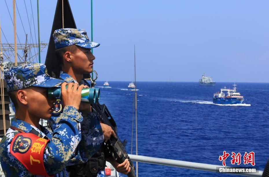 记者近日登上海口舰,近距离探访这艘被誉为“中华神盾”的海军舰艇。图为2017年第27批护航期间,海口舰官兵位舷边了望警戒。(资料图片) 中新社记者 王晓斌 摄