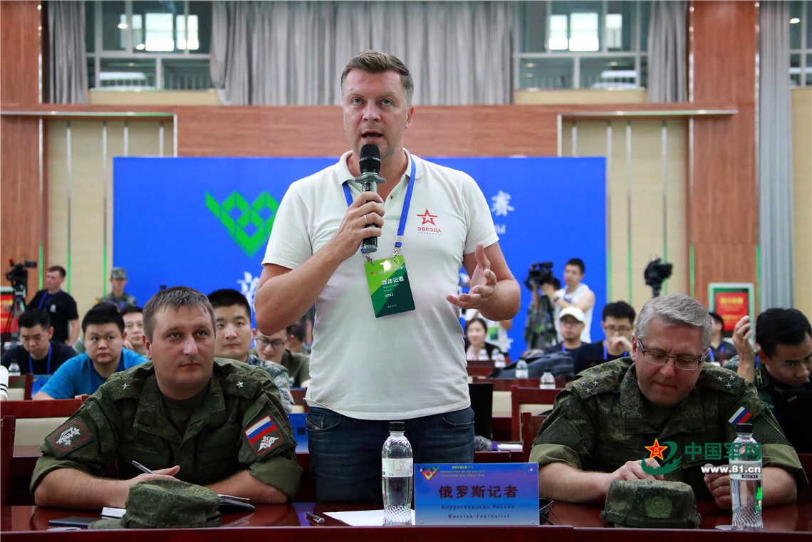 7月27日,中国陆军在新疆库尔勒召开承办“国际军事比赛-2018”赛前新闻发布。这是参会的外国记者提问。袁凯 摄