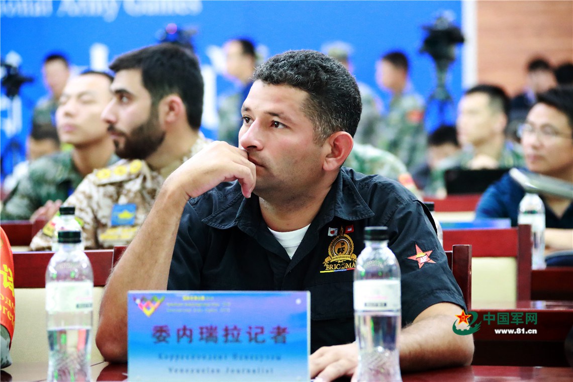7月27日,中国陆军在新疆库尔勒召开承办“国际军事比赛-2018”赛前新闻发布。这是参会的外国记者。袁凯 摄