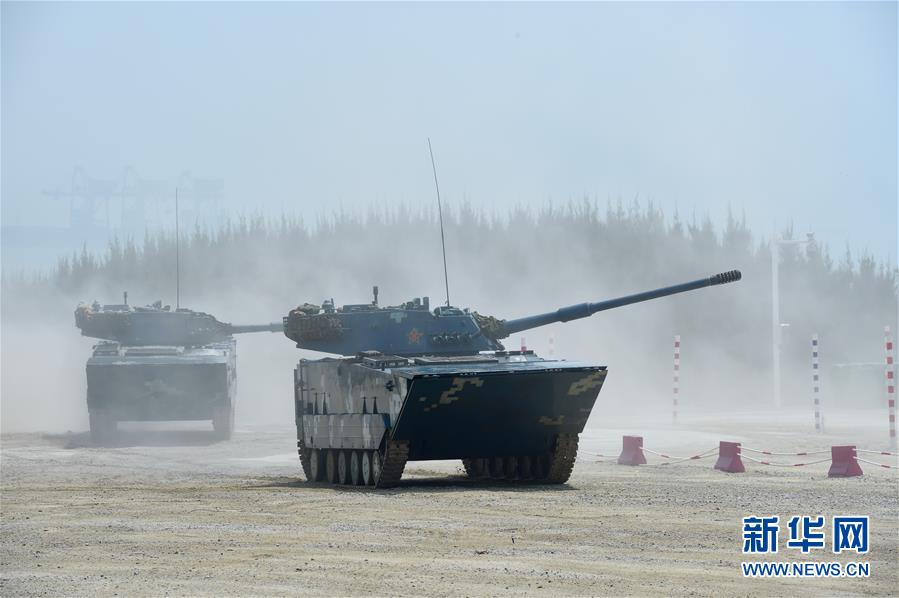 7月29日,在福建泉州赛区开幕式上进行的三栖立体登陆作战课目军事表演中,中国海军陆战队两栖装甲战车进行射击。 当日,“国际军事比赛-2018”中国承办赛事开幕式分别在新疆库尔勒市和福建泉州市举行。 新华社记者 姜克红 摄
