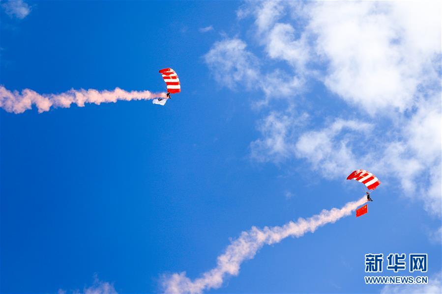 这是7月29日在新疆库尔勒赛区开幕式上进行的跳伞表演。 当日,“国际军事比赛-2018”中国承办赛事开幕式分别在新疆库尔勒市和福建泉州市举行。 新华社发(尹阿龙 摄)