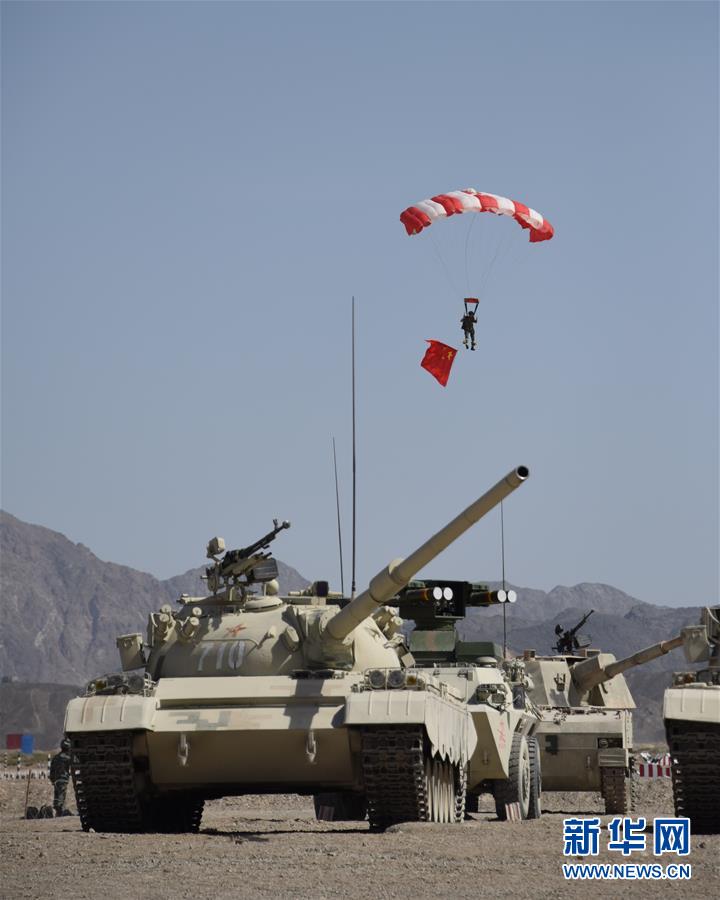 7月29日,在新疆库尔勒赛区开幕式上进行的跳伞表演。 当日,“国际军事比赛-2018”中国承办赛事开幕式分别在新疆库尔勒市和福建泉州市举行。 新华社记者 黎云 摄