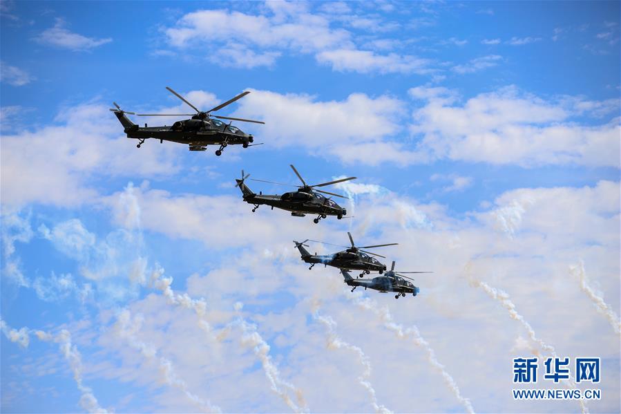 7月29日,在新疆库尔勒赛区开幕式上,四架武直-10直升机通过观礼台。 当日,“国际军事比赛-2018”中国承办赛事开幕式分别在新疆库尔勒市和福建泉州市举行。 新华社发(王鹏飞 摄)
