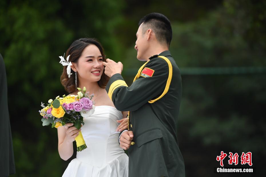 7月29日,八一建军节来临之际,中国人民解放军南部战区陆军某训练基地为9对新人举办集体婚礼,他们在亲人、战友的见证下幸福牵手,走进婚姻殿堂。中新社记者 刘冉阳 摄