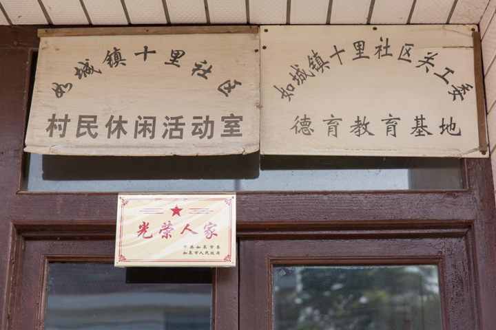 ▲“十里社区关工委德育教育基地”、“十里社区村民休闲活动室”的牌匾。