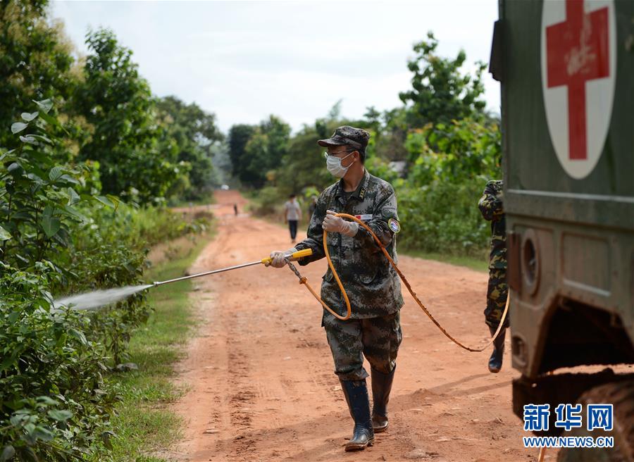 7月29日,在老挝阿速坡省萨南赛县灾区,中国人民解放军“和平列车”医疗队队员进行消毒防疫工作。