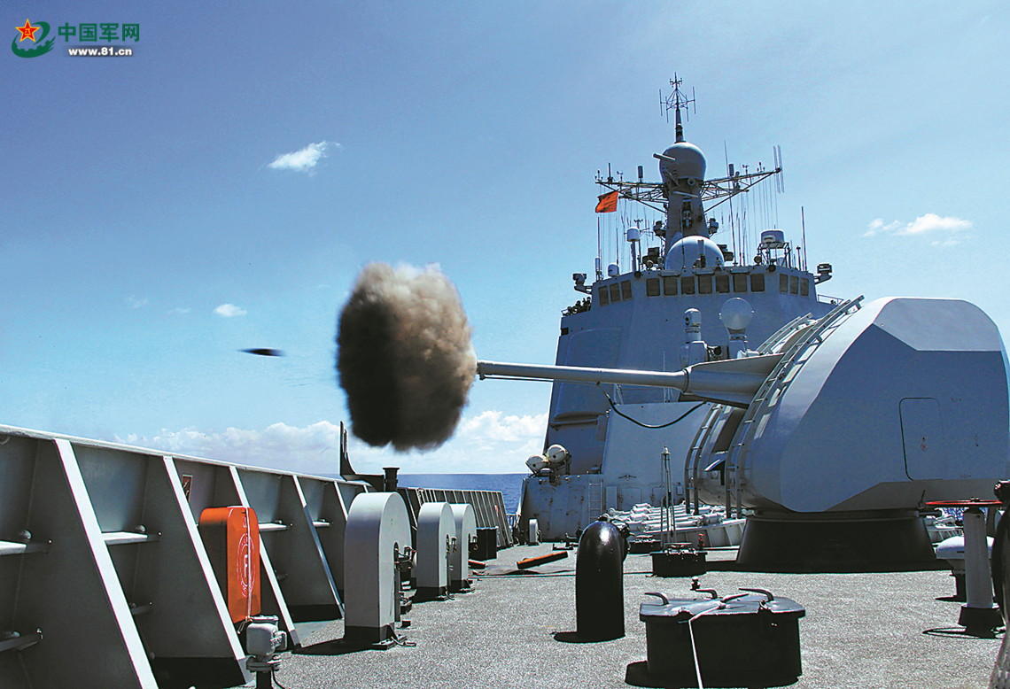 在实战化训练中,海口舰主炮对海上目标实施打击。