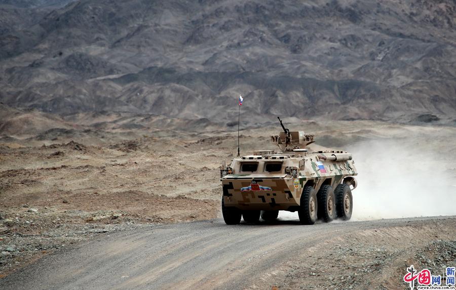 外军参赛选手驾驶战车疾驰在赛道上。袁凯 摄