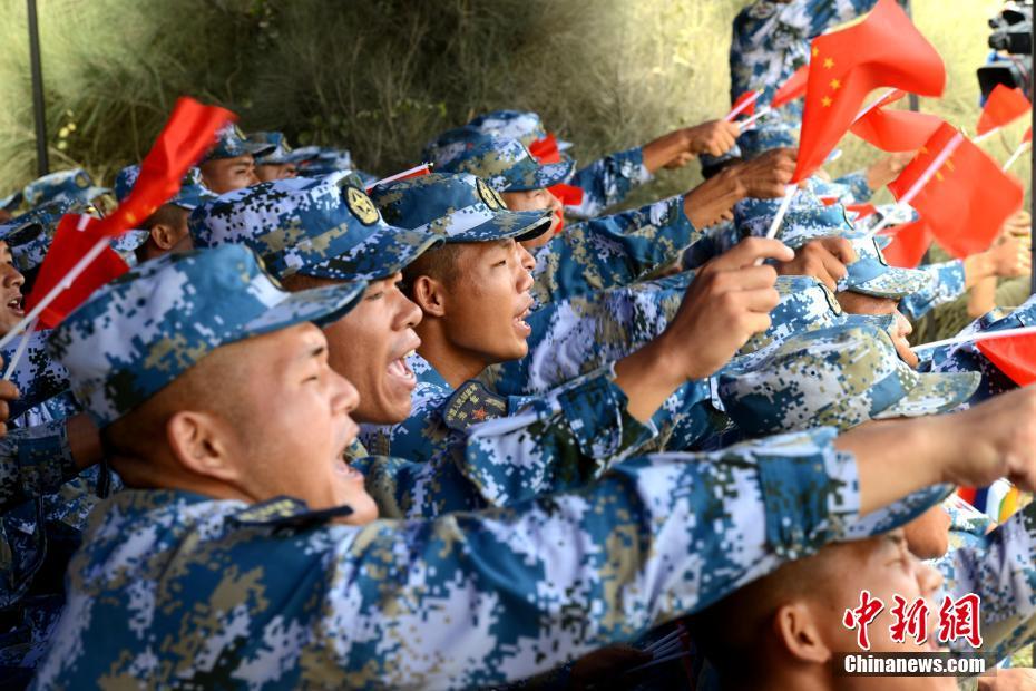 8月2日,“国际军事比赛-2018”海上登陆赛举行了求生赛第一轮比赛,中国、伊朗、俄罗斯、委内瑞拉4个国家共7个陆战班,依次完成4公里武装越野、通过障碍、班战斗射击等比赛课目。经过第一轮比拼,目前中国队2班、3班分别以28分39秒、30分57秒的成绩暂居前2名。图为中国士兵为各国参赛队加油。中新社记者 王东明 摄