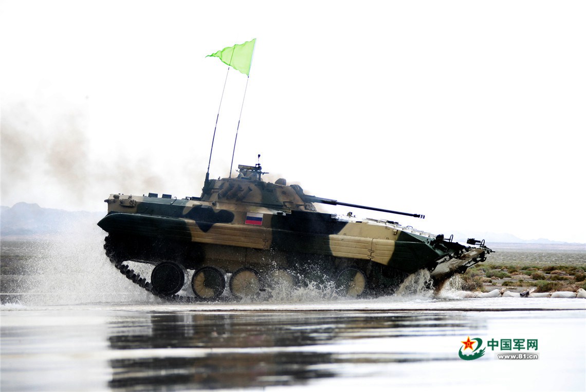 外军参赛队员驾驶战车通过涉水场。袁凯 摄
