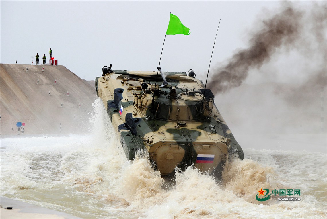 外军参赛队员驾驶战车通过涉水场。袁凯 摄