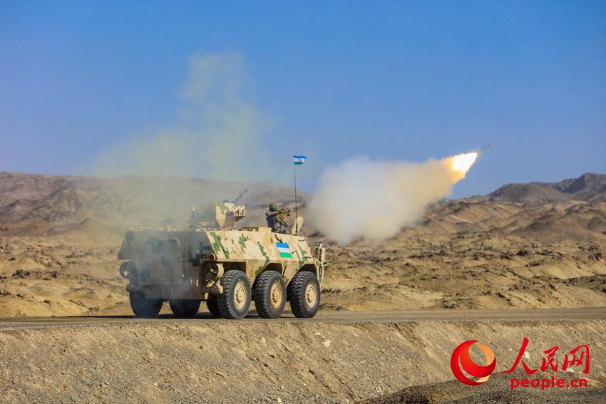 乌兹别克斯坦参赛车组对模拟直升机靶射击瞬间