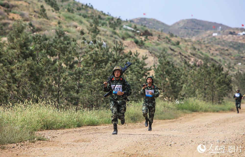 重机枪战术射击课目中,参赛队员携装奔袭两公里,向射击阵地前进。安晓惠摄