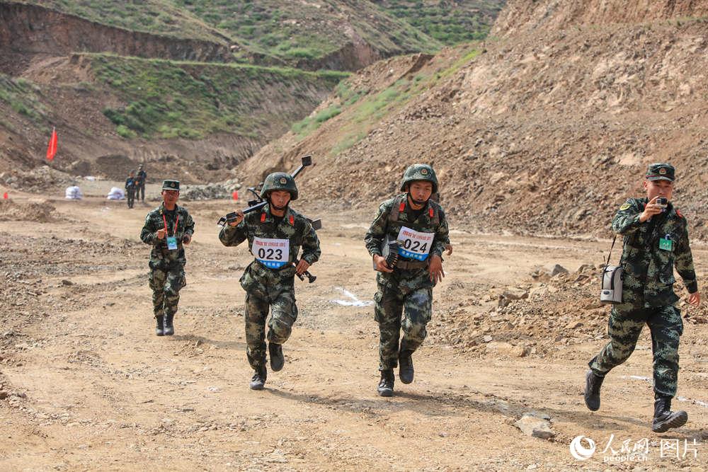 重机枪战术射击课目中,参赛队员携装奔袭两公里,向射击阵地前进。安晓惠摄