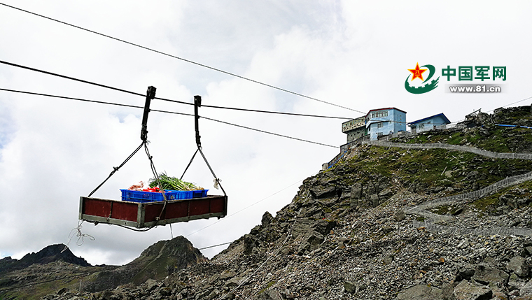 在索道运输平台上,连队官兵将副食、报纸书籍等物资,装入几个特制铁箱中。在他们身旁,一根杯口粗的钢索直入云霄……