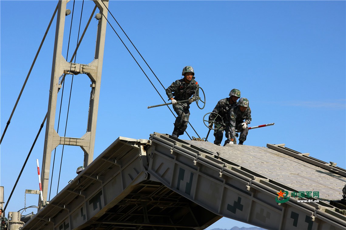 8月3日,中国参赛队员正在进行架桥。