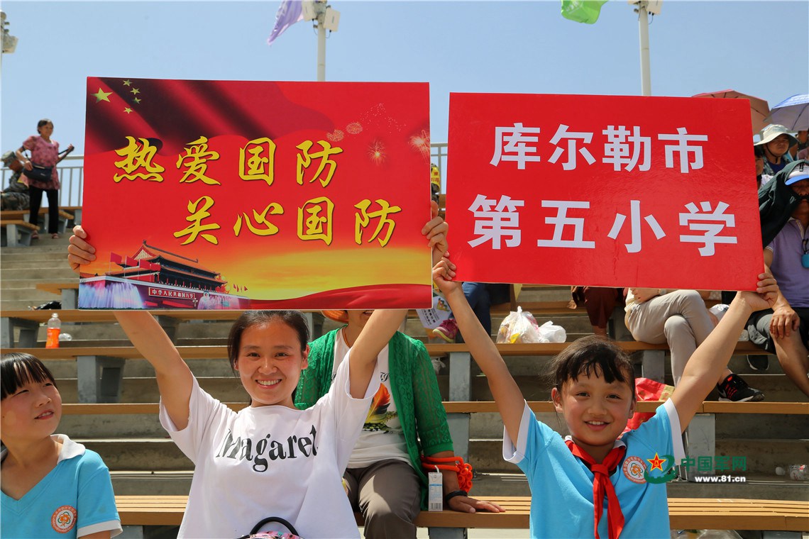 8月5日,观赛观众手举“热爱国防 关心国防”的标语牌。