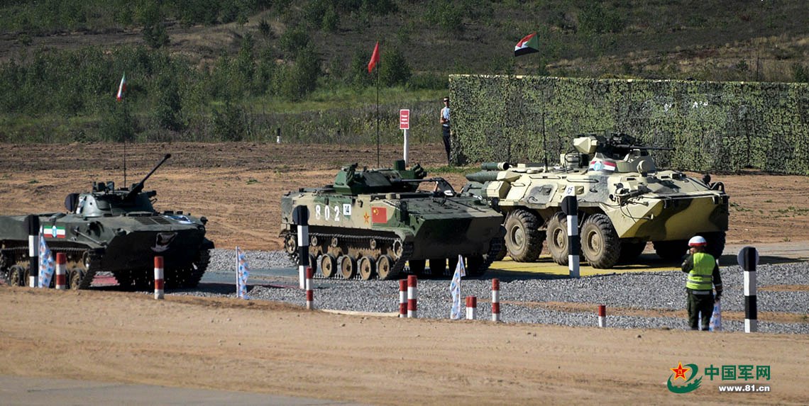 “战车单车赛”课目比赛中各国参赛队战车在出发线待命。秦云涛 摄