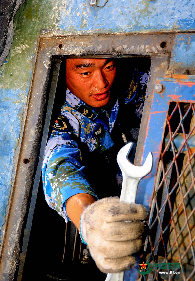 中国队官兵进行车辆维修保养。尚文斌 摄