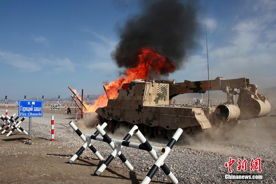 8月7日,“国际军事比赛-2018”新疆库尔勒赛区继续进行“安全路线”工兵分队单项赛。中国、俄罗斯、乌兹别克斯坦3国参赛,每支参赛队30人。据悉,“安全路线”工兵分队比赛是中国陆军首次承办,当天各国工兵需完成道路抢修、清障任务。图为中方参赛官兵驾驶多用途工程车撞开火障。 袁凯 摄