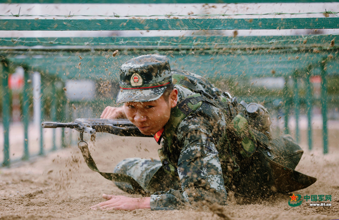 参赛官兵正在进行低姿匍匐比赛。